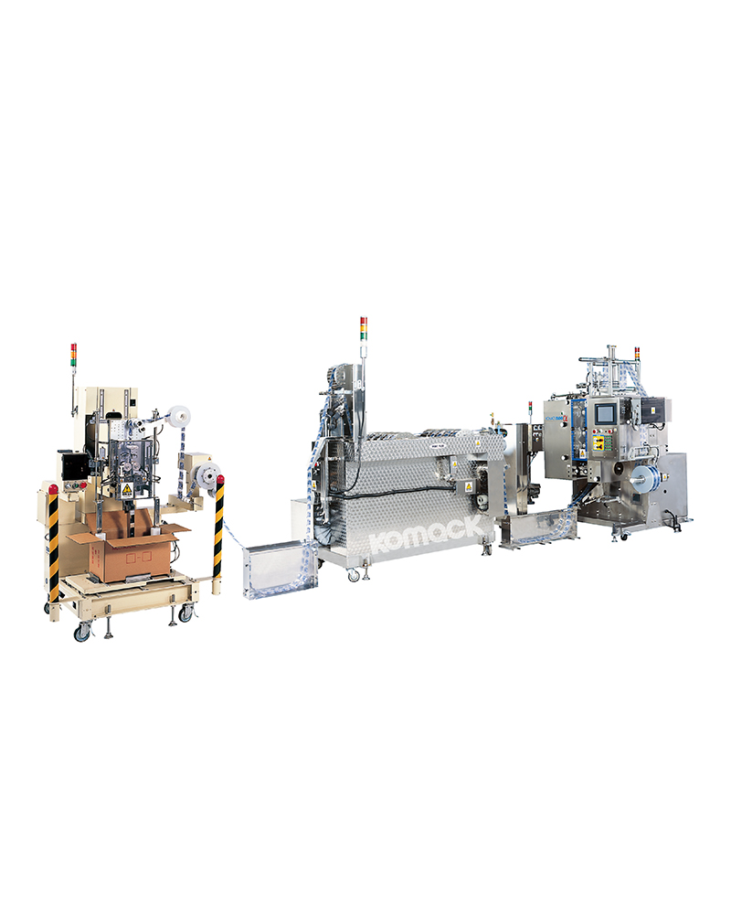 本系統采用連續帶狀形式的生產線,將熱充填后的產品進行保溫·冷卻·除水。與以往將保溫冷卻除水作業分開分別進行的生產線相比,連續帶狀形式具有「因采用邊輕揉產品邊進行保溫·冷卻,所以充填物可均勻熱交換」「因采用低溫殺菌,所以可保持產品的色·香·味」等優點。再加上是連續進行保溫·冷卻·除水作業,因此用極少的人力就可完成。最后,配備產品折入裝箱裝置,單包切割后進行裝袋收集等工程,以低勞動力即可獲得高效率。根據您的需求,請選擇包裝線的配套裝置。